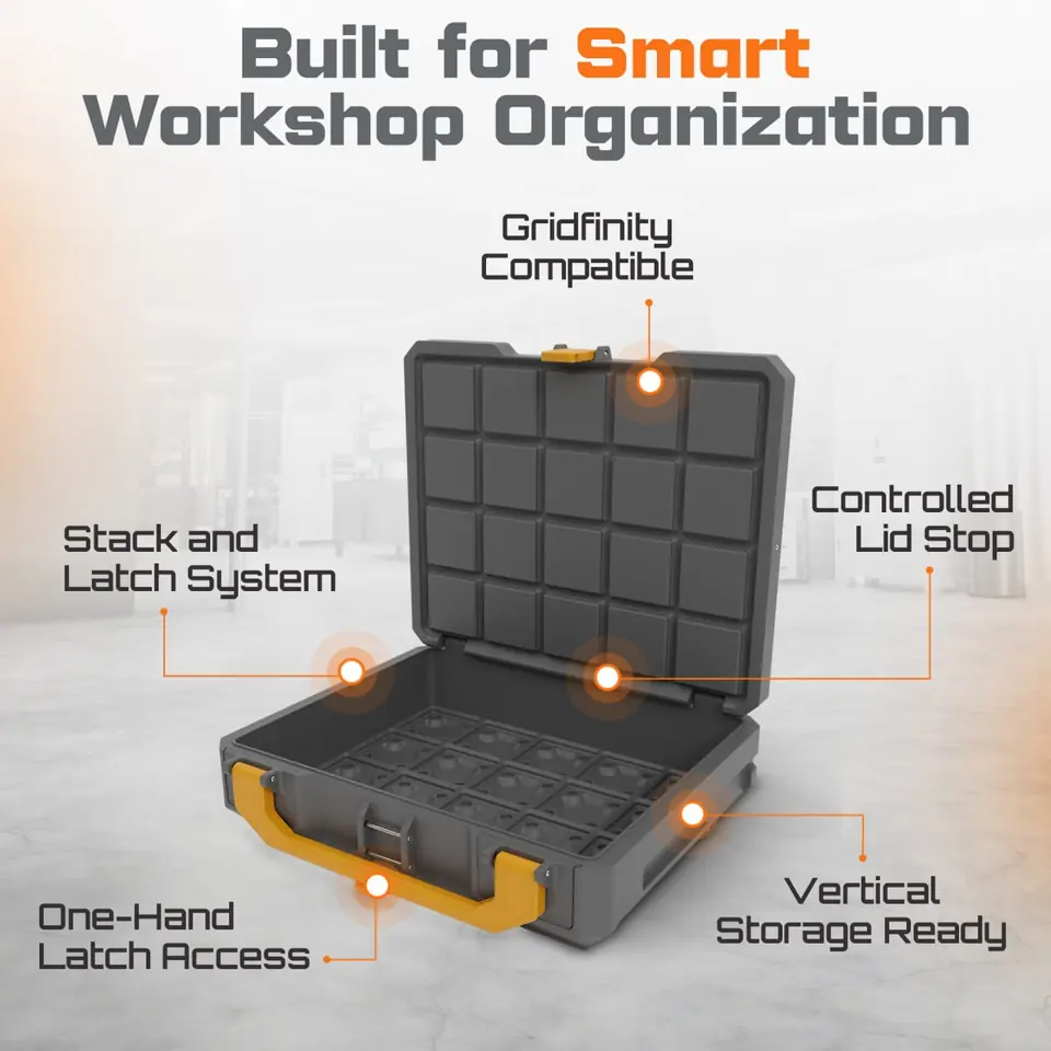 Gridfinity-compatible storage boxes that latch, stack, and scale - built for real workshops.